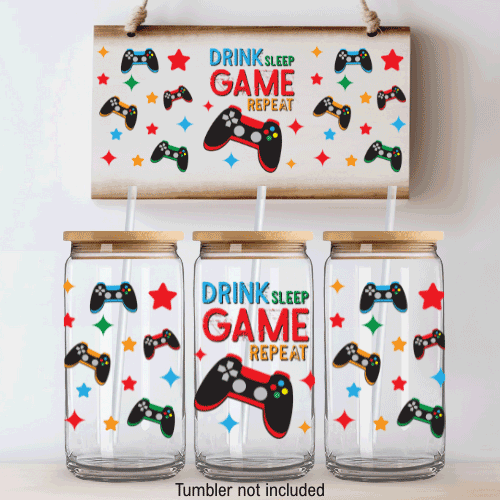 Home :: DTF :: Press Ready UV DTF :: Press Ready UV DTF Decal - 16oz Wrap - Drink, Sleep, Game, Repeat