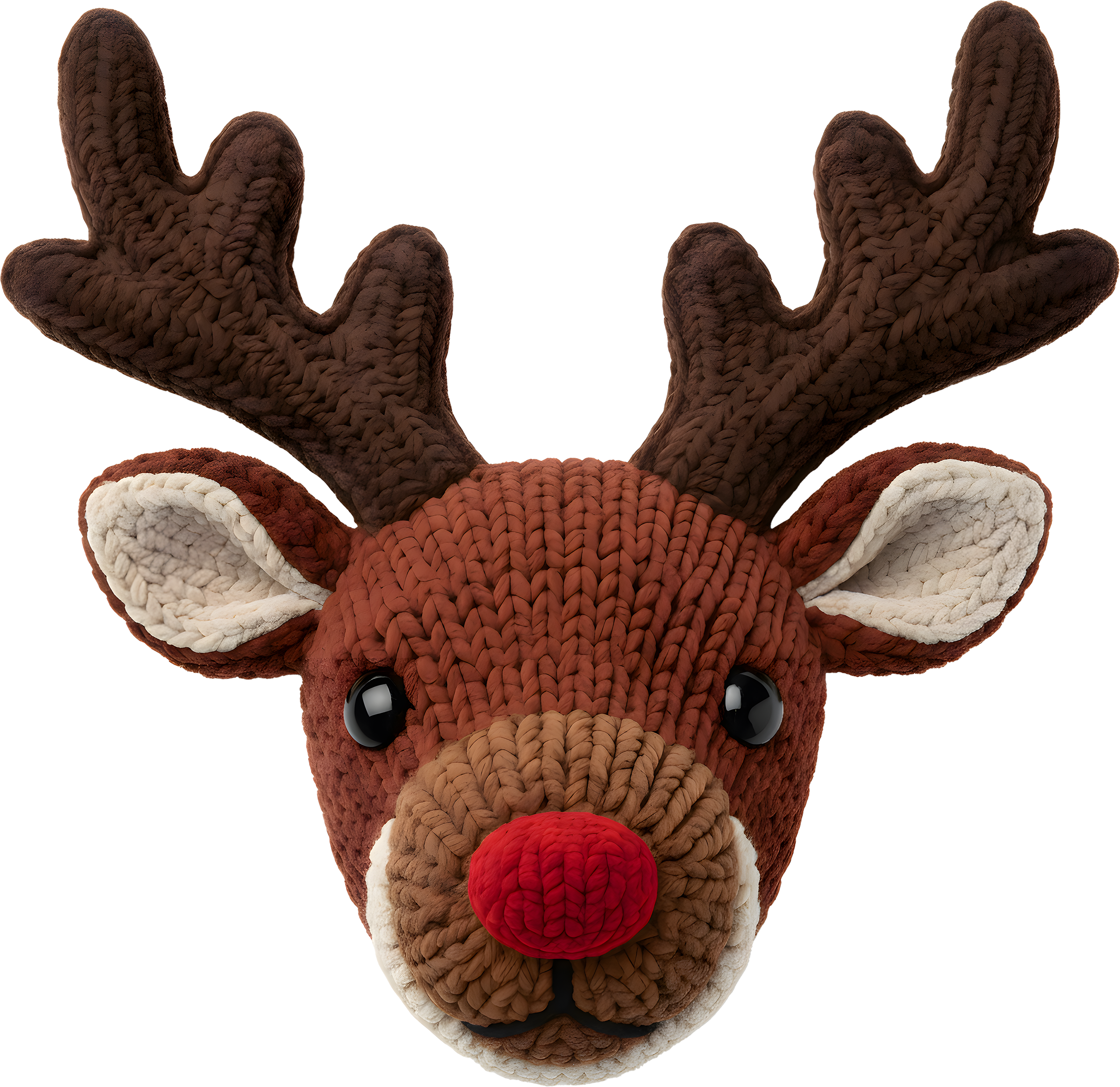 This adorable, plush reindeer is knitted with a cozy, chunky yarn, featuring big brown antlers and a classic, bright red nose. With its sweet expression, this festive friend looks ready to cuddle up for Christmas!