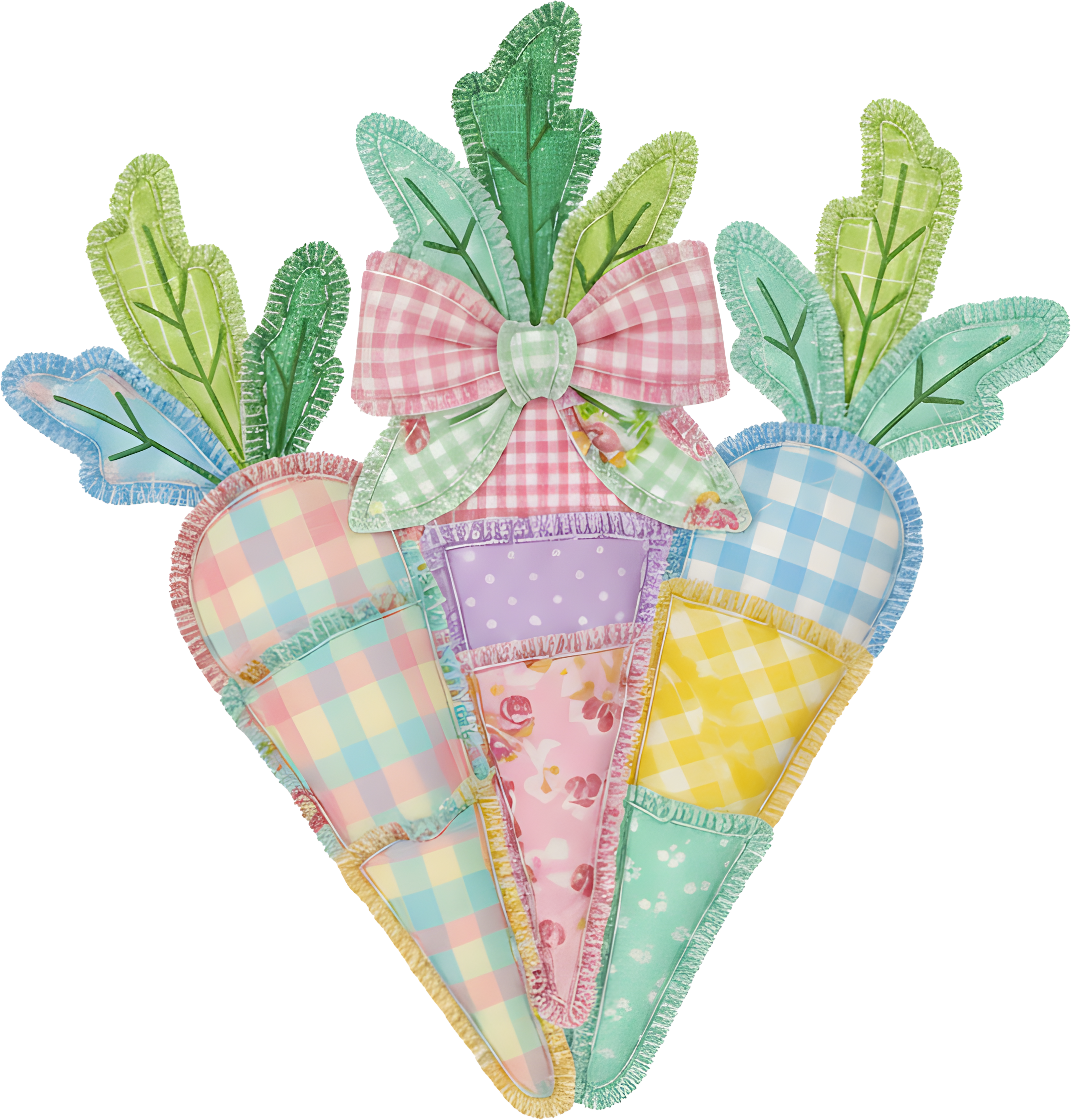 Rooting for something sweet? This Triple Carrot Bouquet is a patchwork dream! Dressed up in charming spring patterns and topped with a perfectly pink checkered bow, these colorful carrots add a touch of rustic, handcrafted magic to any Easter or garden-themed design.