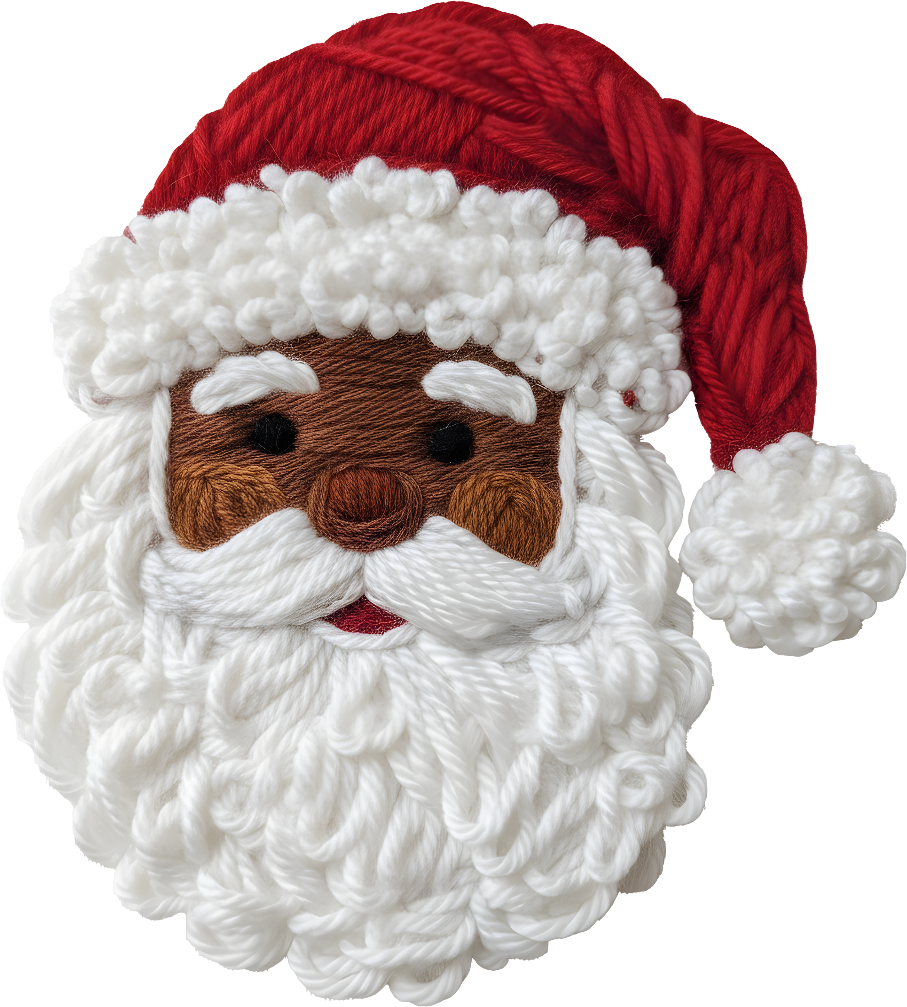 A cheerful Santa Claus, rendered to look like he was stitched entirely from soft yarn. With his fuzzy white beard, dark skin tone, and bright red hat, this fiber art-style piece brings a cozy, handcrafted touch to the holiday season.